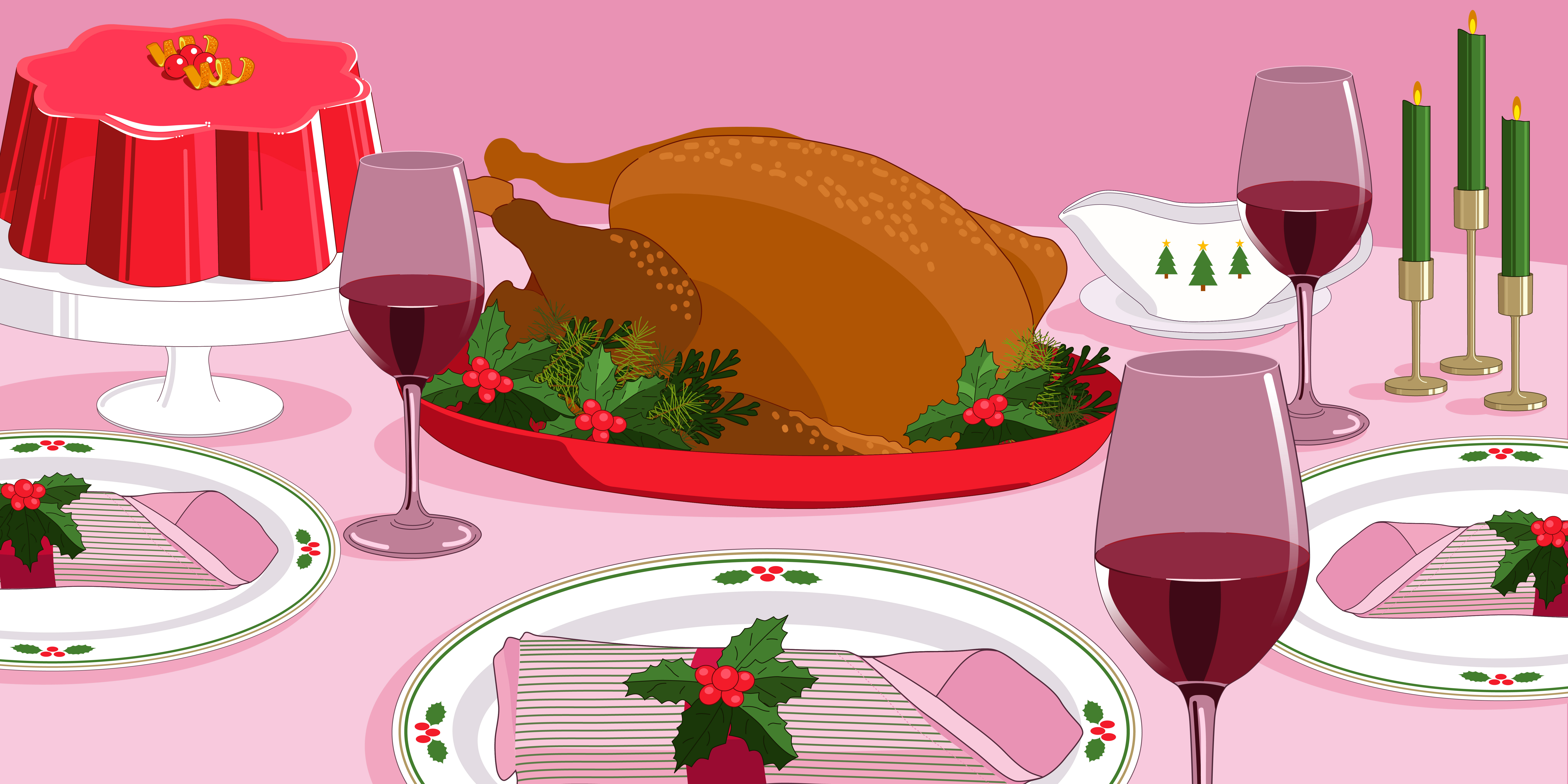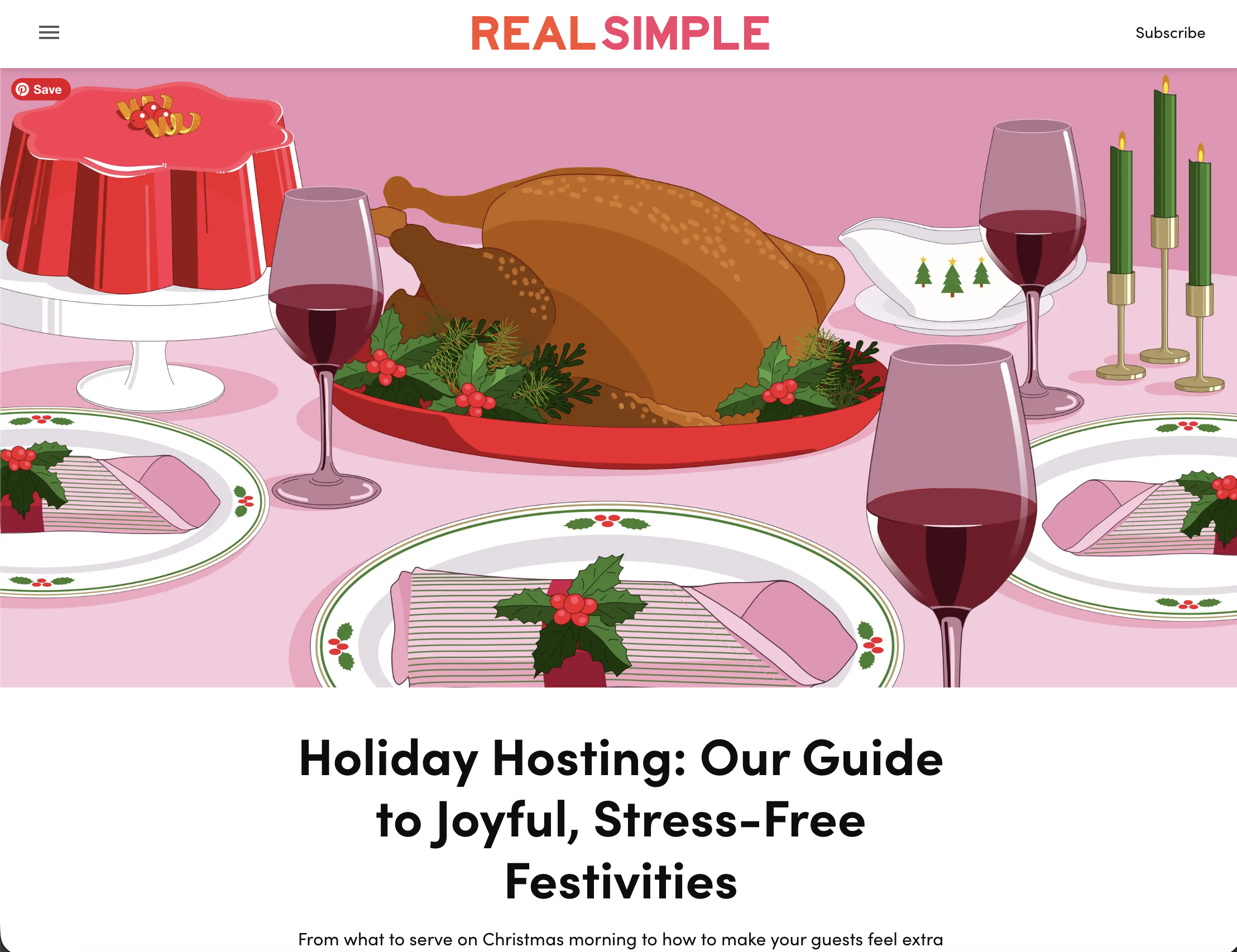 An illustration and photo treatment developed for sponsored content on Real Simple’s website. The content covered from what to serve on Christmas morning to how to make guests feel extra special, and all holiday hosting needs. This illustration synthesizes hosting down to the most important part of a holiday party: the meal, while also incorporating other aspects such as decoration. The pink and red color palette reimagine the traditional red and green, while also fitting into the publication’s branding.